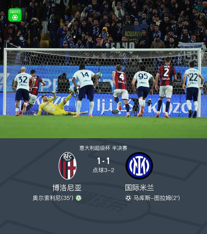 北京时间12月20日意大利超级杯 半决赛,博洛尼亚对阵国际米兰。博洛尼亚奥尔索利尼破门。国际米兰马库斯-图拉姆破门。最终比分博洛尼亚 4-3 国际米兰。