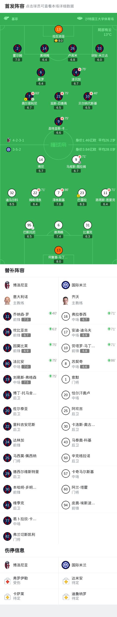 意超杯国米总分3-4被博洛尼亚点杀,巴雷拉、巴斯托尼失点
